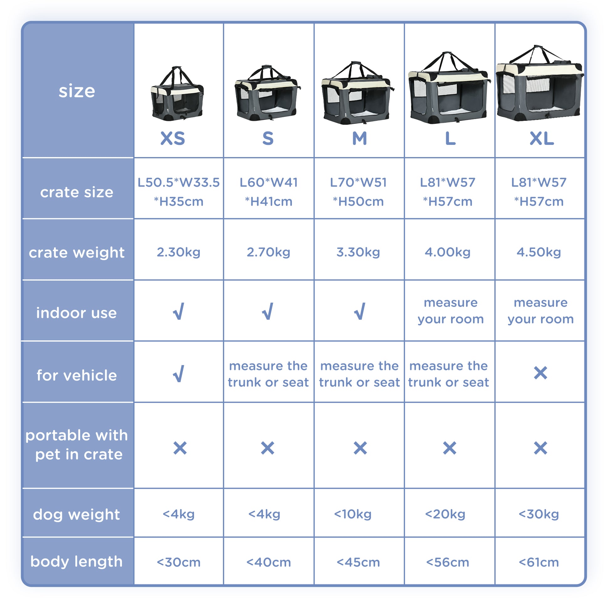 • Dimensions: 41H x 60L x 41Wcm. Folded: 8H x 60L x 41Wcm. Front door: 42L x 26.5Wcm. Left door: 26.5L x 27.5Wcm. Top door: 45L x 21Wcm. Cushion: 55L x 37Wcm. Storage pocket: 15L x 16Wcm. Straps: 90cm
